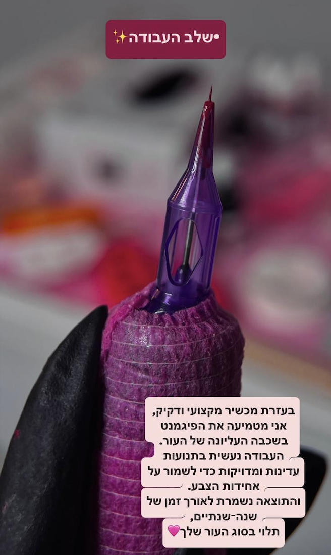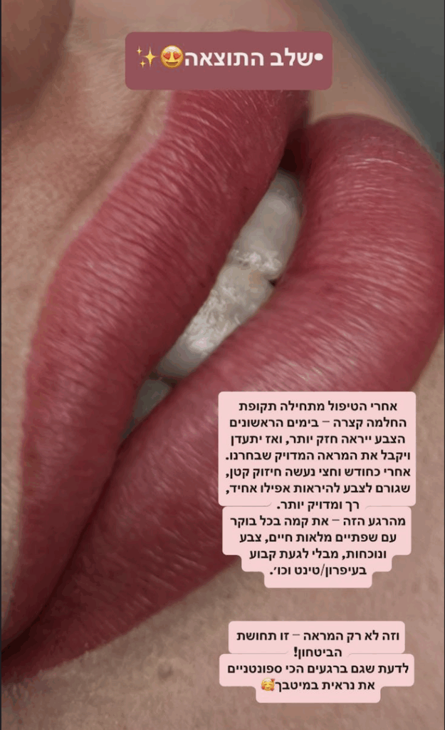 במהלך הטיפול מחדירים פיגמנט עדין לשכבת העור העליונה כדי להחזיר צבע, לרכך את קו המתאר ולשפר את אחידות השפתיים בלי להוסיף נפח.